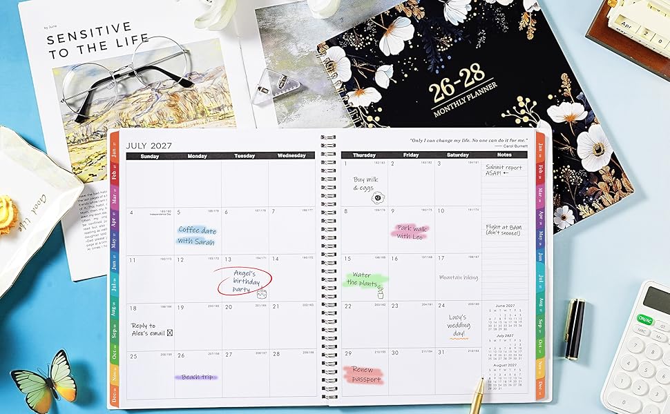 Monthly Overview - Each monthly page covers past, present and future month mini calendar for quick reference. Also,there are note section for you to write important things, plans and so on. Besides,36 colorful monthly tabs help you access any month quickly. Inspiring quotes on each monthly page in the monthly page keep you motivated.