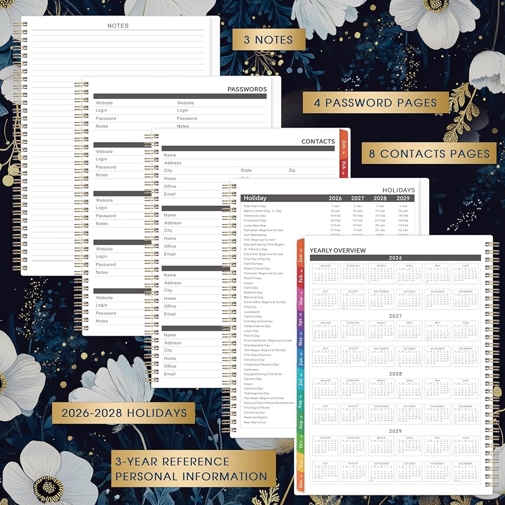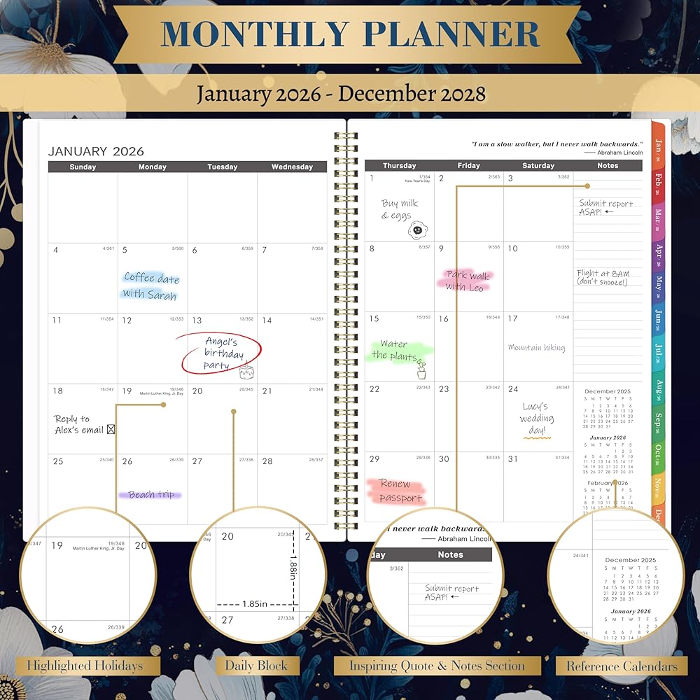 Boost Your Productivity for 3 Years - From Jan 2026 to Dec 2028,you don't buy no new planners every year,which can keep your long-term goals and schedules all in one place. Whether it's tracking important meetings, planning study schedules or managing family activities, this 3 year calendar 2026-2027-2028 monthly planner has got you covered.