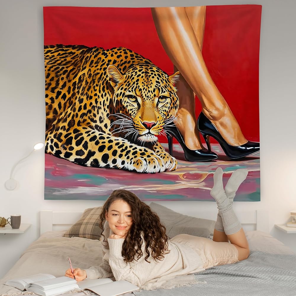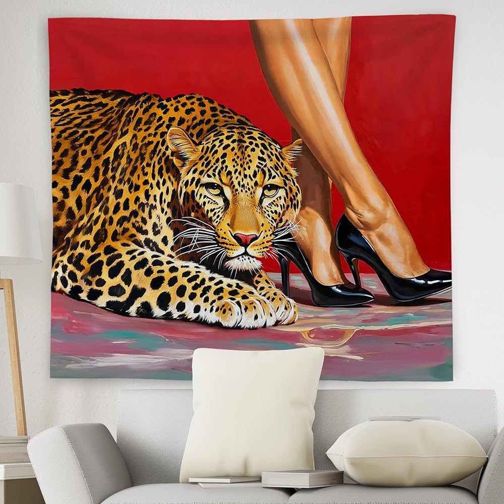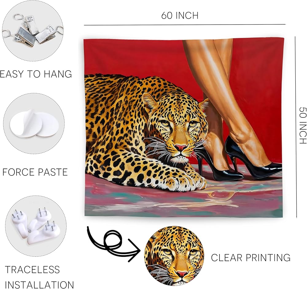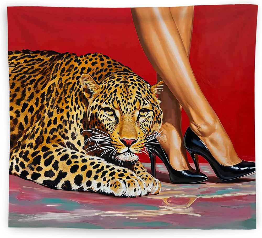 WNAGT Trendy Red Leopard Tapestry Wall Hanging, Retro Fashion Cheetah and High Heels Female Wall Blanket Decor for Girls Room Bedroom College Dorm Apartment Home, 50x60 Inch