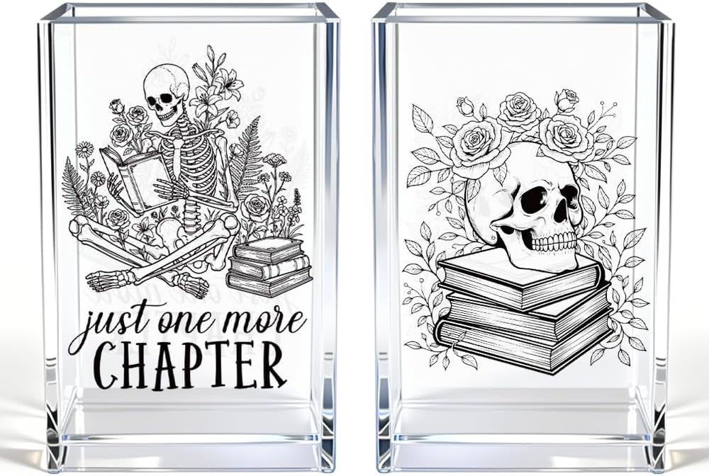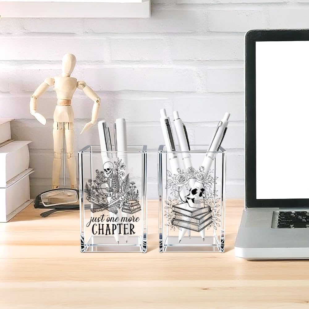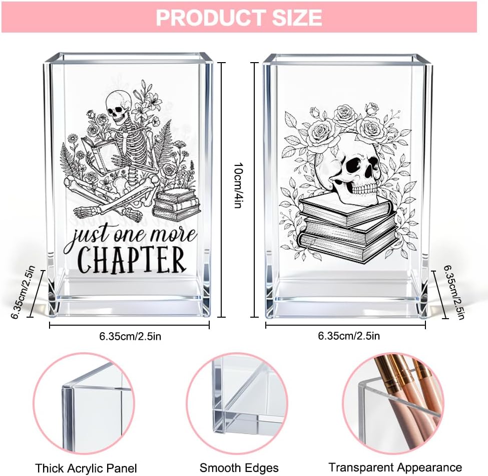 Just One More Chapter Acrylic Pen Holder Cup Set 2, Funny Skull Pencil Holder Desk Organizer, Skull Office Desk Accessories, Sarcastic Book Lover Gifts for Women Men Bookworms Coworkers Teachers
