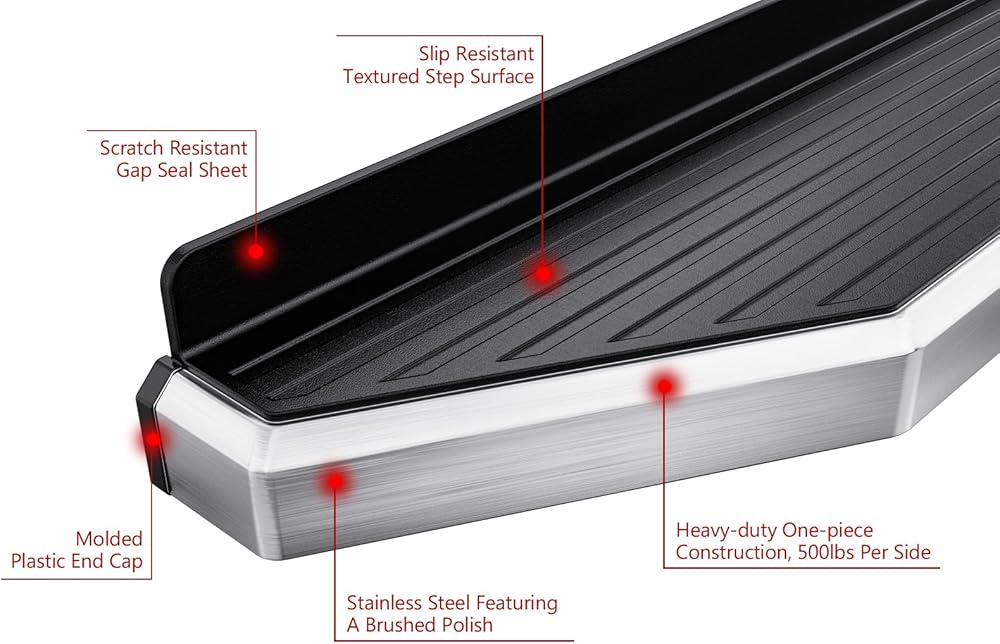 Unmatched Durability: Crafted from Stainless Steel, these running boards offer exceptional resistance to rust, ensuring they withstand the test of time.