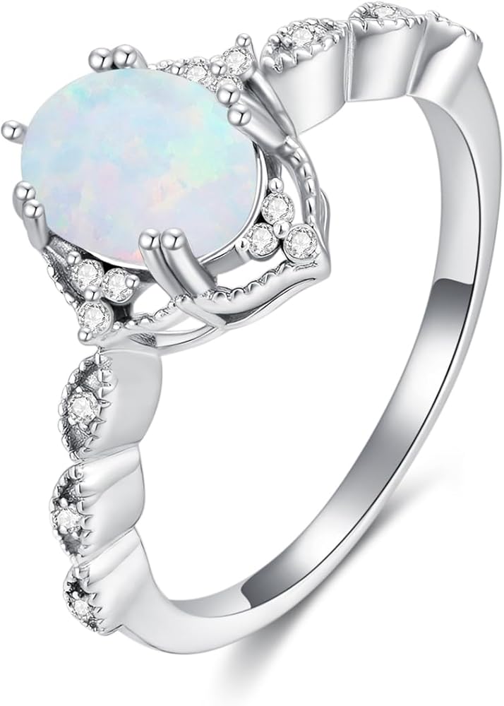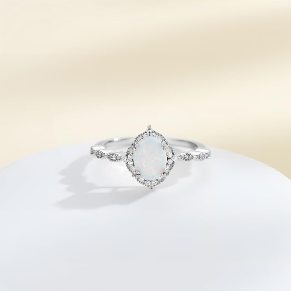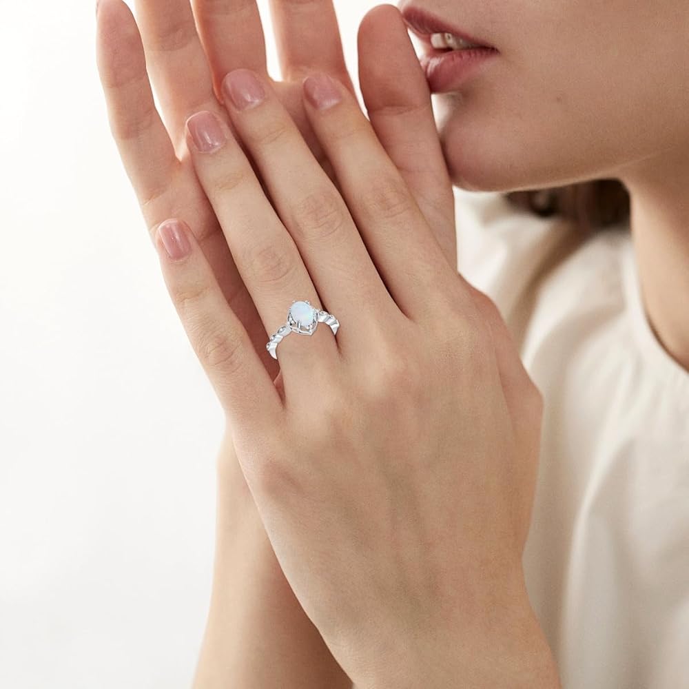 【PREMIUM MATERIAL】The center stone features premium quality 1.5 carat oval cut white opal in 4-prong setting. It is crafted from genuine 925 sterling silver, indicated by the stamped 925, to provide lasting shine and durability.