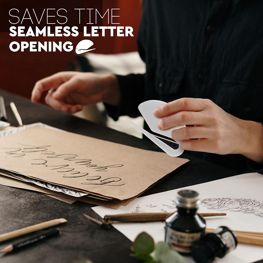 ✅𝐐𝐔𝐀𝐋𝐈𝐓𝐘➤The envelope opener slitter is made of durable premium plastic and stainless-steel blade of environmentally friendly materials, with a pointed mouth design. Insert the blunt guide plate under the corner of the envelope cover, and then slide the cutter along the edge to easily cut it without paper jam.