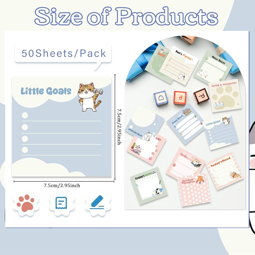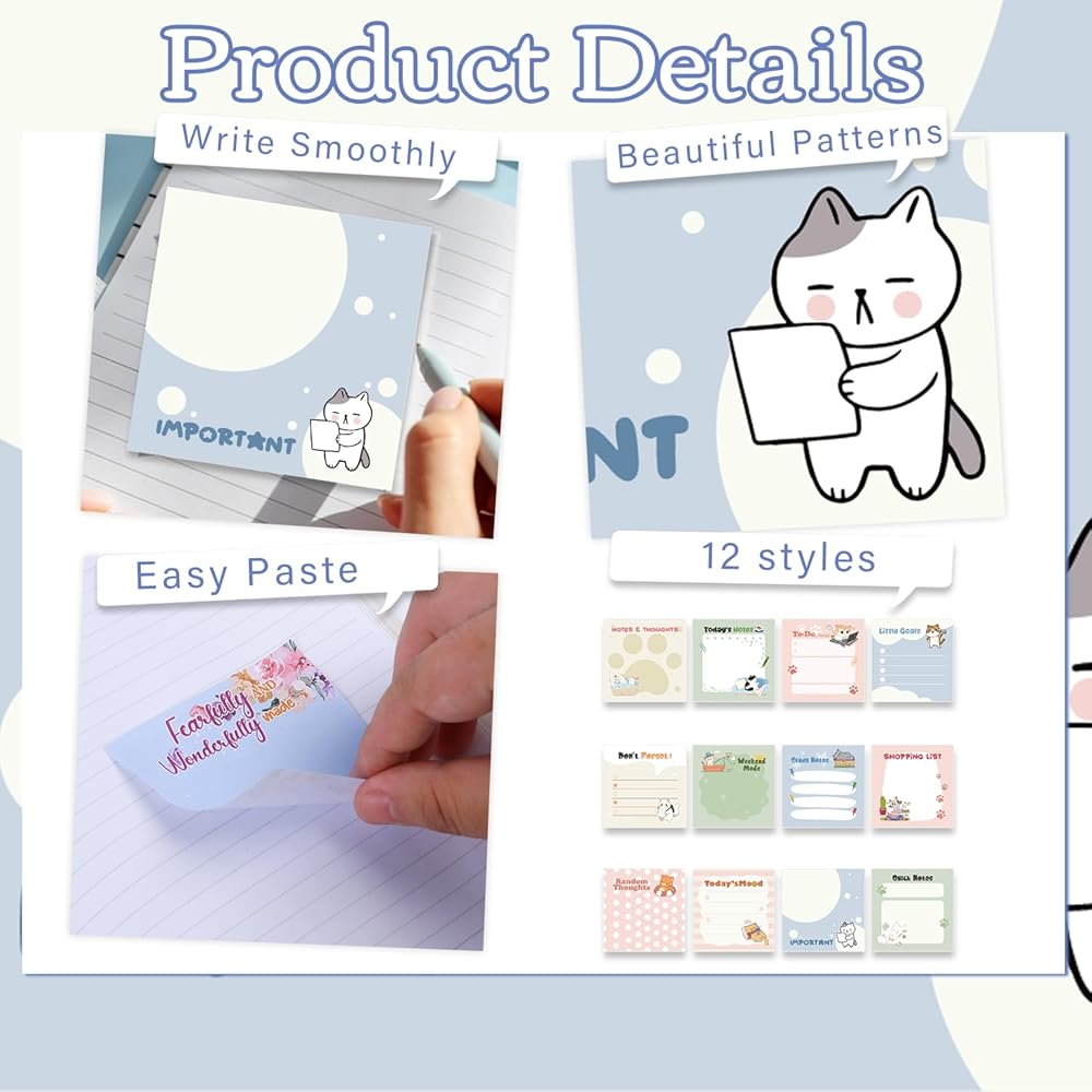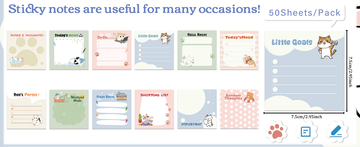 Cat Design: These sticky notes feature adorable cartoon cat illustrations, adding a delightful and engaging touch to your memos. The charming designs appeal to cat enthusiasts and brighten up office or school supplies