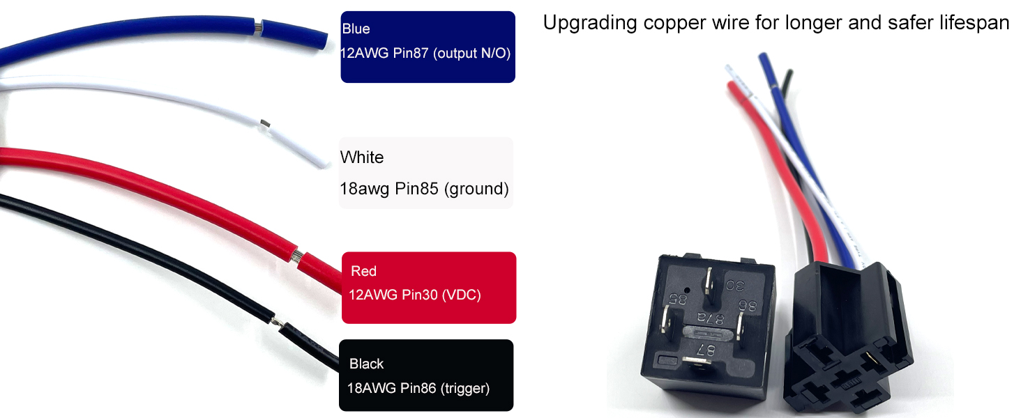 【Harness specification】Upgraded Heavy 12/18 AWG harness. White-18awg Pin85 (ground), Black-18AWG Pin86 (trigger), Red-12AWG Pin30 (VDC), Blue-12AWG Pin87 (output N/O), (Specific white, black, red, and blue wires correspond to the interface, please open the relay connection port to check the corresponding number.