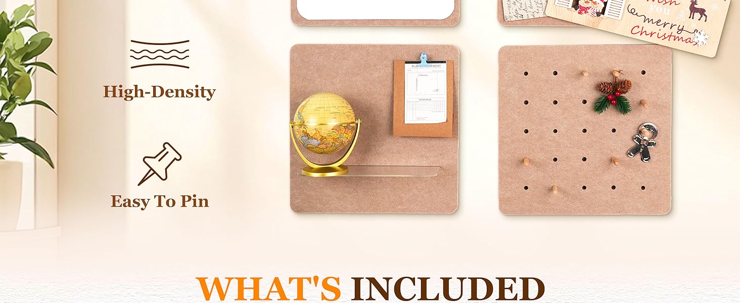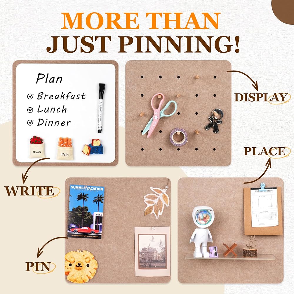 All in one Kit: Includes 4 pack 12" x 12" high-density felt boards, 20 wooden pegs, 10 pushpin and an acrylic shelf—everything for your decorative setup.