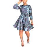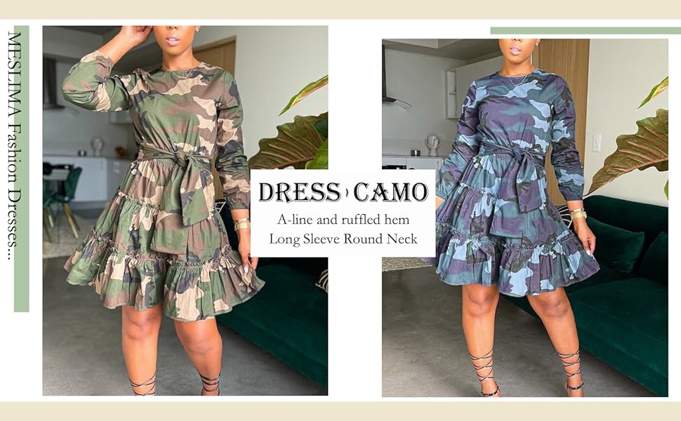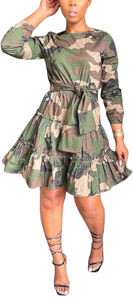 Features: camouflage print, round neck, long sleeves, high-waisted A-line skirt, belted, loose hem with ruffled hem, fashionable dress.