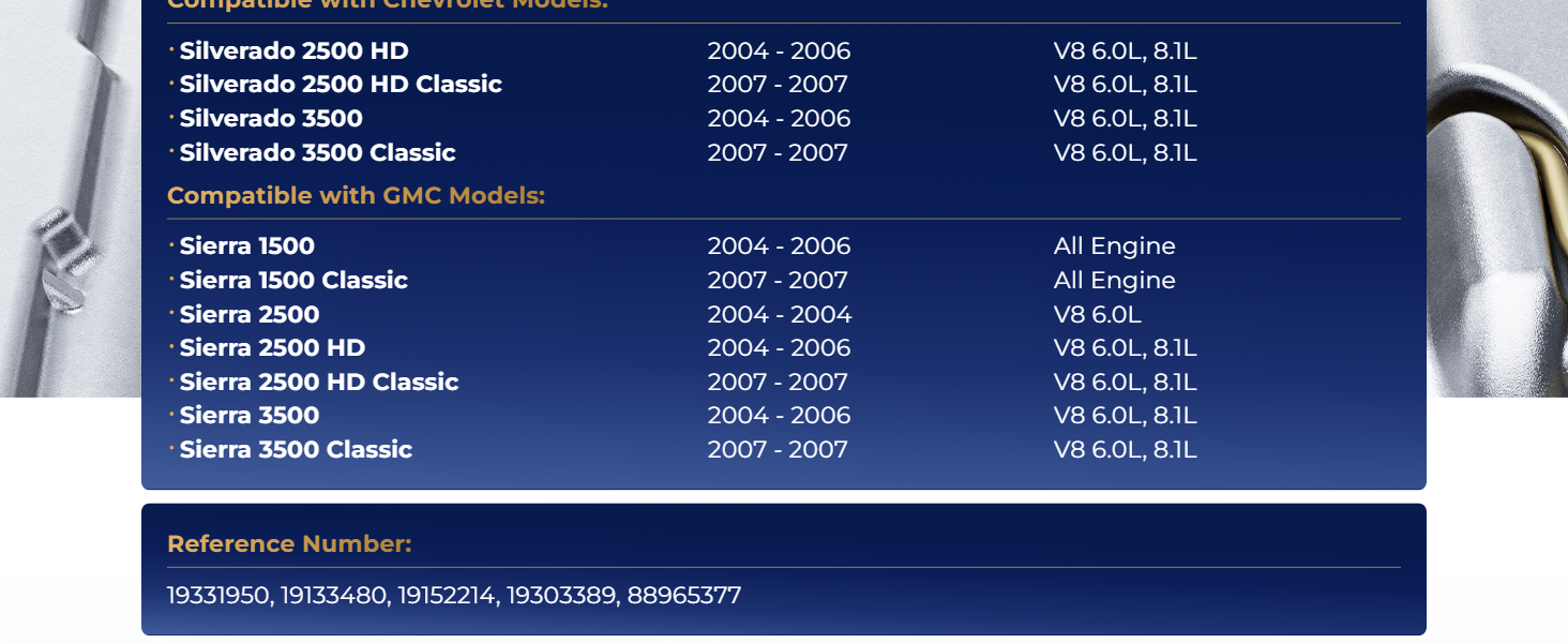 [Compatibility] - Compatible with Chevrolet Silverado 1500 2004-2006, Silverado 1500 Classic 2007, Silverado 2500 2004, Silverado 2500 HD 2004-2006, Silverado 2500 HD Classic 2007, Silverado 3500 2004-2006, Silverado 3500 Classic 2007, GMC Sierra 1500 2004-2006 - 4.3L 4.8L 5.3L 6.0L 8.1L