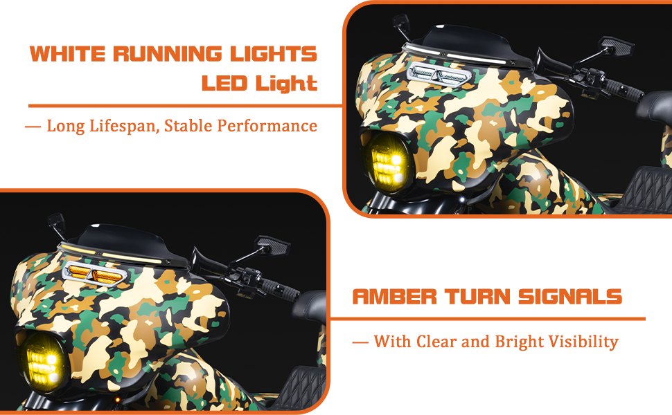 Dual-Color LED Lighting: Super-bright white daytime running lights and amber turn signals deliver maximum visibility and improved safety on the road