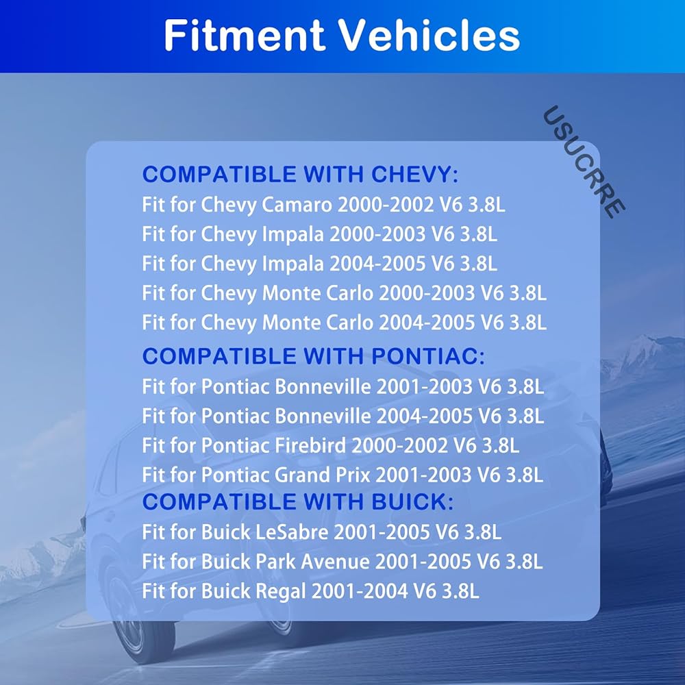 Compatible with Buick LeSabre 2001-2004,for Park Avenue 2001-2005,for Regal 2001-2004, Compatible with Chevrolet Camaro 2000-2002,for Impala 2000-2004,for Monte Carlo 2000-2004, Compatible with Pontiac Bonneville 2001-2005,for Firebird 2000-2002,for Grand Prix 2001-2003---3.8L