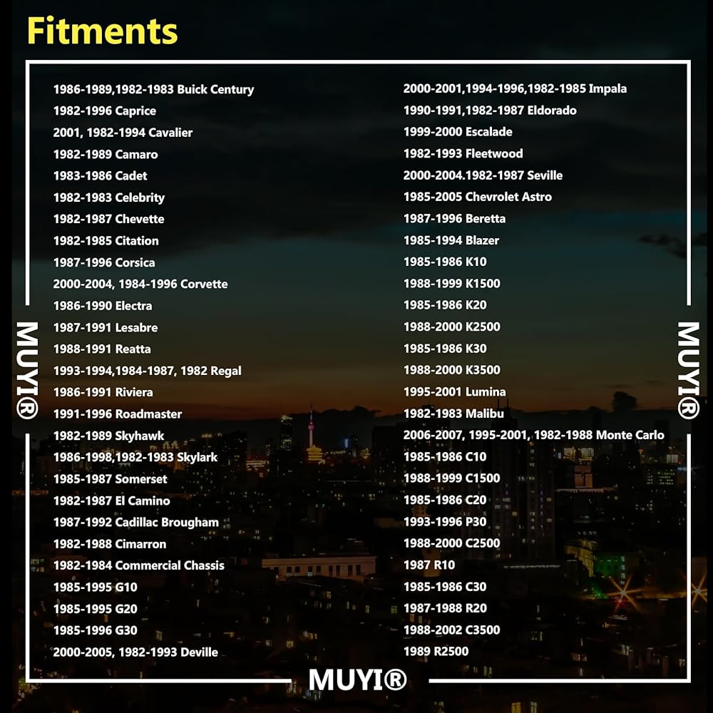 Fits Astro Beretta Blazer C10 C1500 C20 C2500 C30 C3500 Cadet Camaro Caprice Cavalier Celebrity Chevette Citation Corsica Corvette El Camino G10 G20 G30 Impala K10 K1500 K20 K2500 K30 K3500 Lumina Malibu Monte Carlo P30 R10 R20 R2500 R30 R3500 S10 Suburban Tahoe V10 V20 V30 V3500