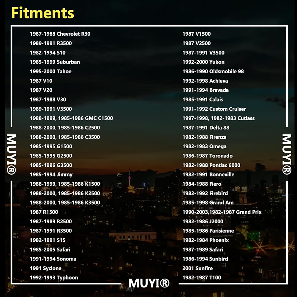Fits GENERAL C1500 C2500 C3500 G1500 G2500 G3500 Jimmy K1500 K2500 K3500 R1500 R2500 R3500 S15 Safari Sonoma Suburban Syclone Typhoon V1500 V2500 V3500 Yukon; Oldsmoble 98 Achieva Calais Custom Cruiser Cutlass Delta 88 Firenza Omega Toronado; Pontiac 6000 Bonneville Fiero Firebird Grand Am Grand Prix J2000 Parisienne Phoenix Safari Sunbird Sunfire T1000