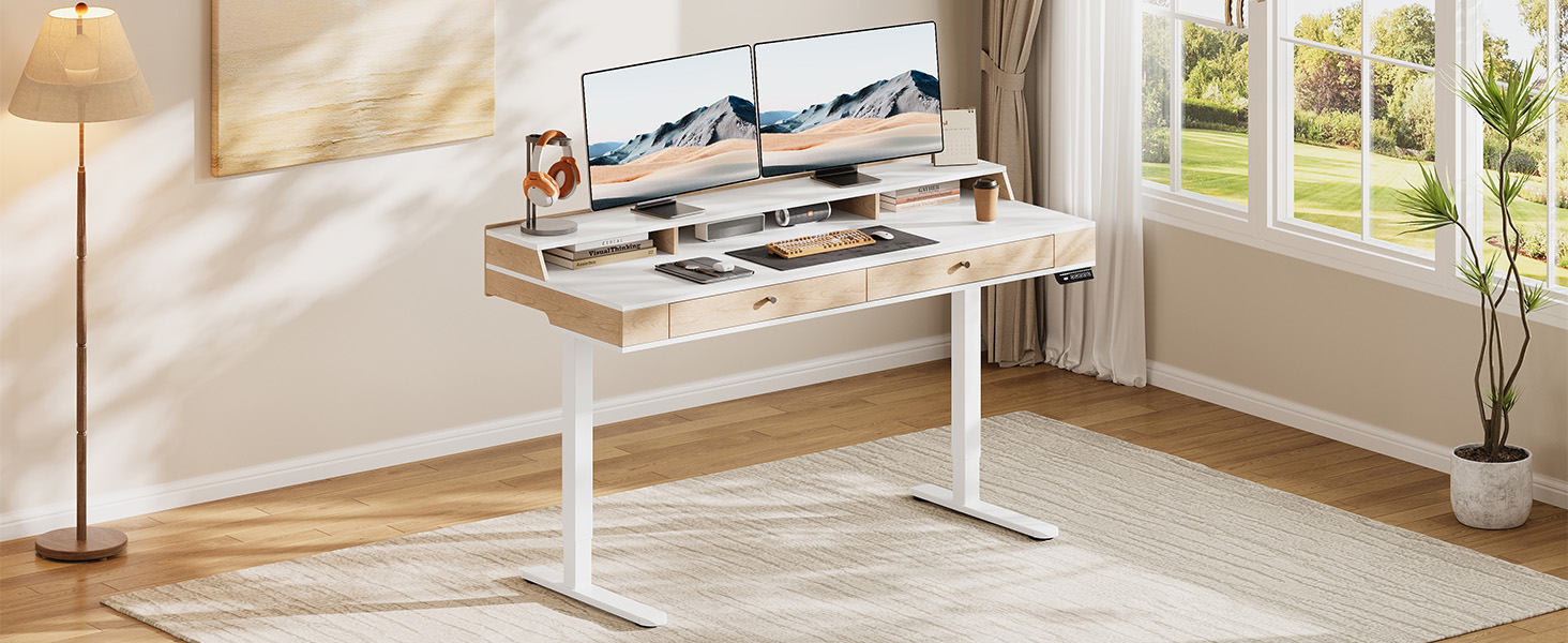 Ergonomic Monitor Shelf & Ample Storage: Elevate your screen to eye level for better posture and less neck strain. The built-in monitor stand keeps you comfortable during long workdays. Below, an open cubby holds daily essentials, while two wooden drawers stash supplies neatly—boosting both comfort and organization in your workspace.