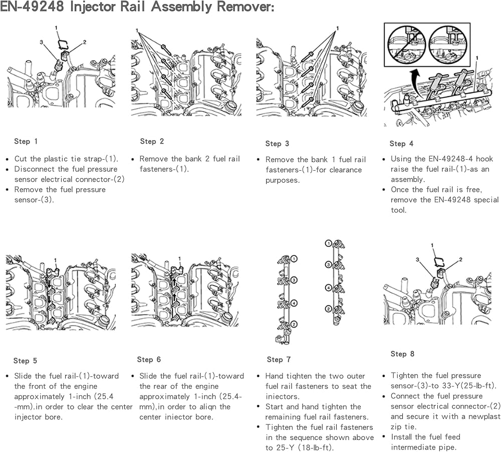 ZLPTEAM EN-49248 Injector Rail Assembly Remover Tool 6706 for Cadillac, Saturn, Pontiac and Chevrolet 27-214 Direct Injection Engines. Works on 27 - 214 General Motors direct injection vehicles. 4.3L 3.6L 3.0L GDI V6, 2.5L 2.4L 2.0L GDI I-4. Note: If you are working on a 5.3L or 6.2L you will need a quantity of 2 sets.