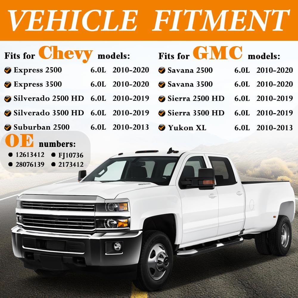 【FITMENT】-Compatible with Chevy: Express 2500 6.0L 2010-2020, Express 3500 6.0L 2010-2020, Silverado 2500 HD 6.0L 2010-2019, Silverado 3500 HD 6.0L 2010-2019, Suburban 2500 6.0L 2010-2013, Sierra 2500 HD 6.0L 2010-2019; Compatible with GMC: Savana 2500 6.0L 2010-2020, Savana 3500 6.0L 2010-2020, Sierra 2500 HD 6.0L 2010-2019, Sierra 3500 HD 6.0L 2010-2019, Yukon XL 2500 6.0L 2010-2013.