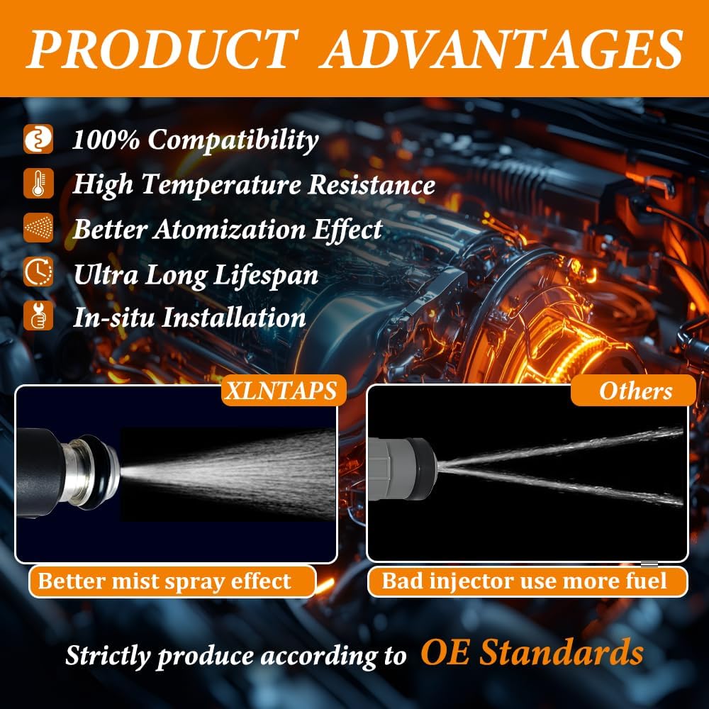 【PREMIUM MATERIAL】- The XLNTAPS fuel injectors is manufactured strictly in accordance with OE specifications and are made of composite materials, which can prevent corrosion of the fuel control body and extend its service life. High temperature viton O-rings can extend the sealing time of fuel injectors under extreme high temperature conditions.
