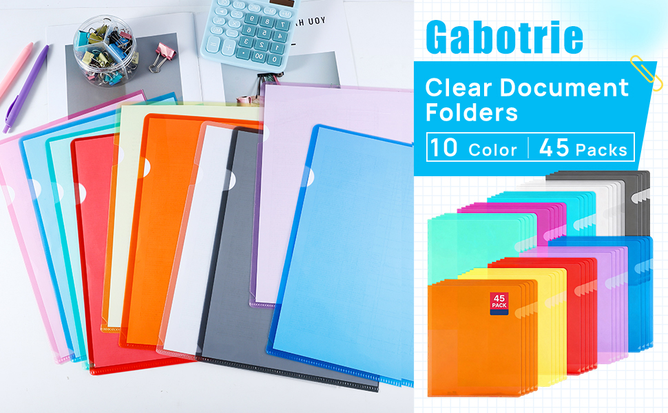 Clear Plastic Document Folders: This set includes 45 colorful clear plastic folders sized 12.2 x 8.7 in (31 x 22 cm), compatible with US letter size and A4 size paper. The folders come in 10 colors: 5 red, 5 yellow, 5 light blue, 5 green, 5 transparent, 4 purple, 4 pink, 4 orange, 4 navy, and 4 dark grey. The generous quantity and color variety help meet different filing and organizing needs for everyday use.