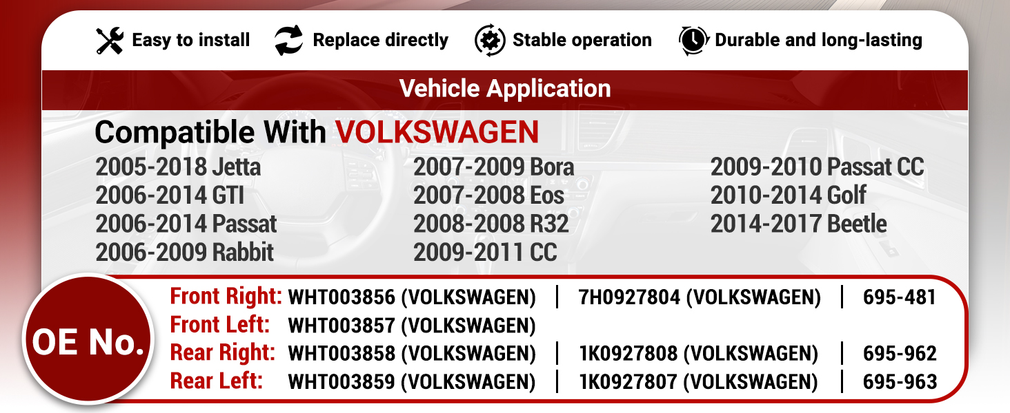 Direct OE Replacement: Seamlessly replaces original part numbers such as Front Right WHT003856/7H0927804, Front Left WHT003857, Rear Right WHT003858/1K0927808, and Rear Left WHT003859/1K0927807, offering performance and reliability equal to the original equipment.