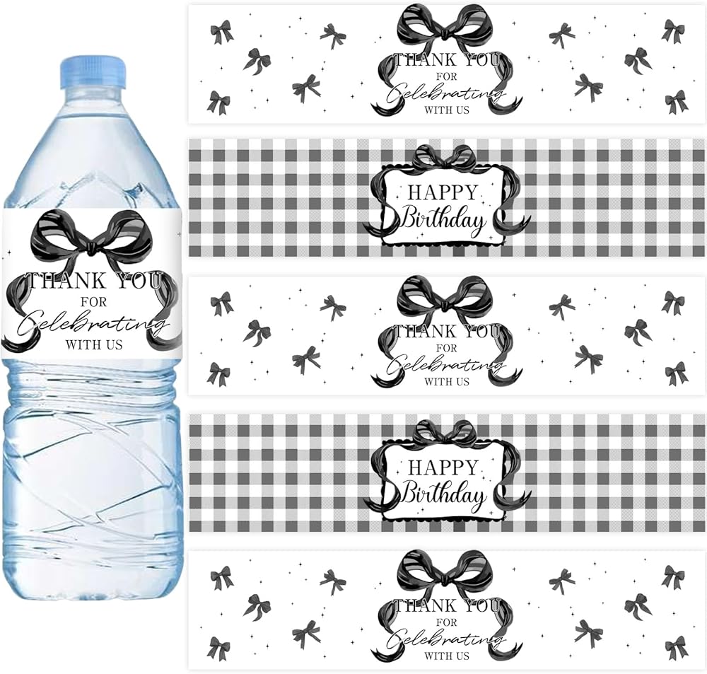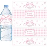 Unique Pink Bow Design: The design showcases a sweet pink bow motif against both classic white and gingham check backgrounds, creating a sophisticated yet playful aesthetic. Each label features the text 'happy birthday' in graceful lettering, surrounded by delicate bow fonts, this can help create a bow theme throughout your celebration.
