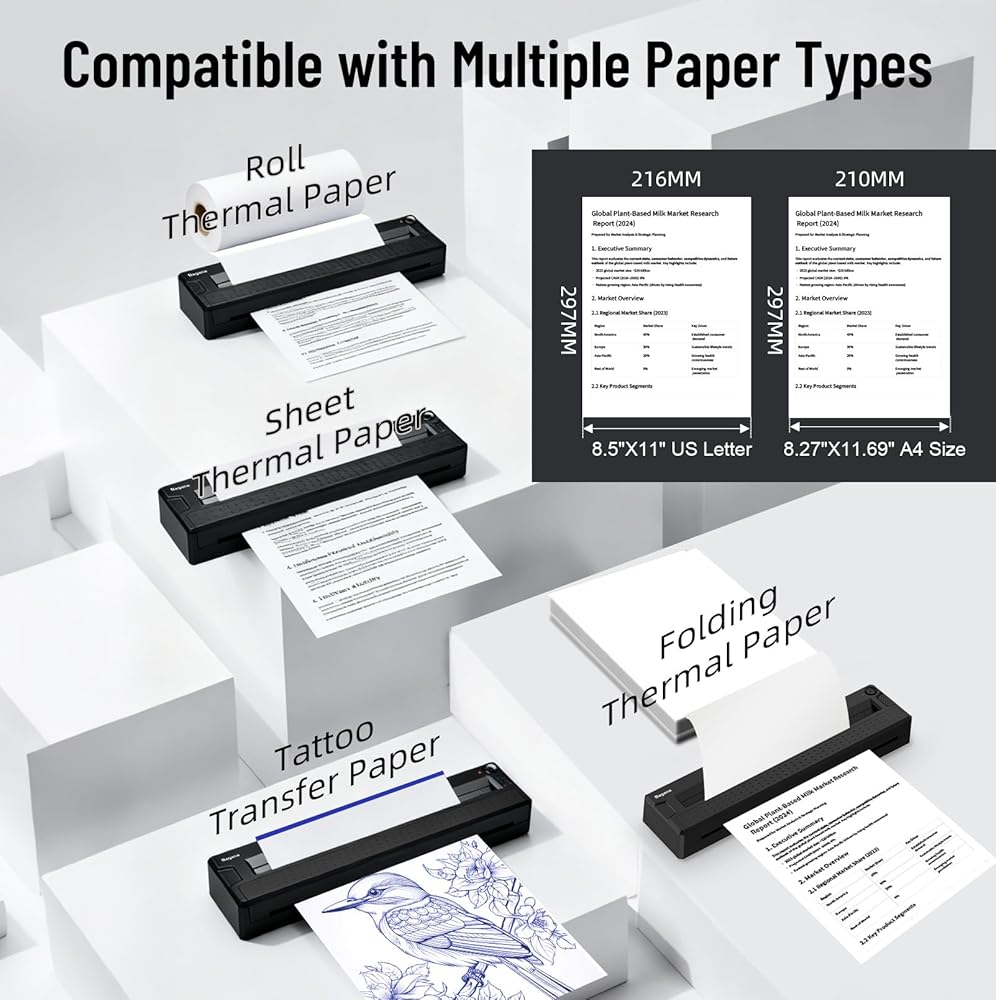 【Smart App & Effortless Workflow】Simplify printing with the intuitive dedicated app. This portable printer for iPhone and Android allows you to import, adjust, and print documents (Word, Excel, PDF, images) or tattoo stencils with one tap. The streamlined workflow makes this portable thermal printer 8.5 x 11 accessible for everyone.