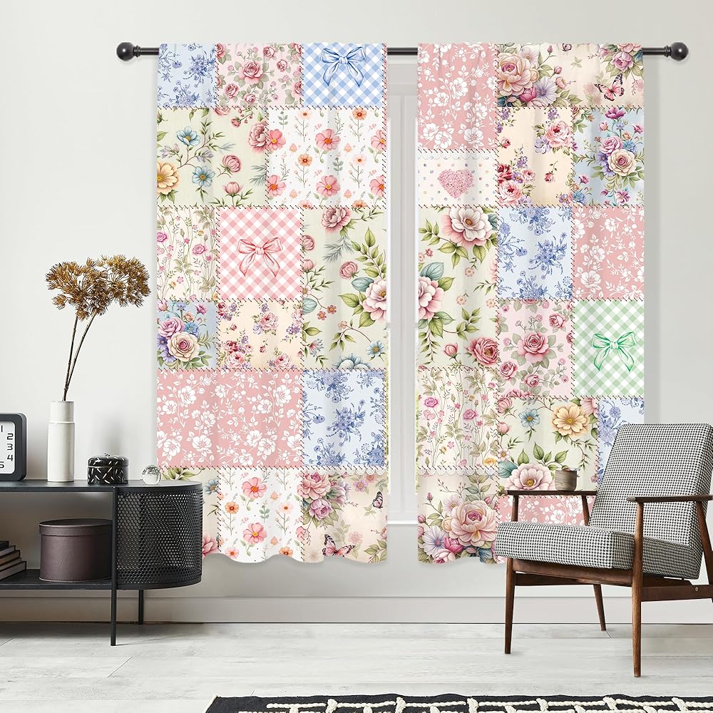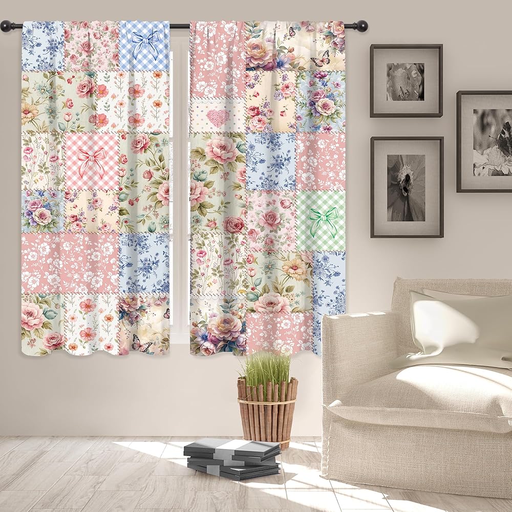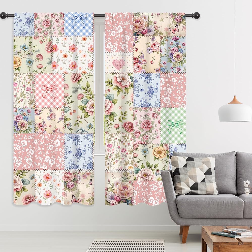 Riyidecor Boho Pink Floral Curtains Shabby Chic Patchwork Vintage Flowers Cute Bohemian Plants Retro Farmhouse Rod Pocket for Women Female Bedroom Living Room Treatment Fabric 2 Panels 42Wx63H Inch