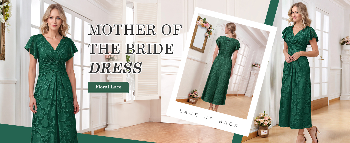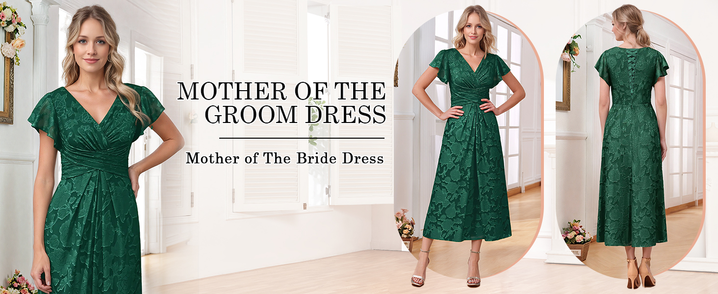 Features: Short Sleeve Mother of The Bride Dress,Lace Floral Mother of The Groom Dress,Chiffon Wedding Guest Dress,Flutter Sleeves,V Neck,A Line,Pleated,Ruffles,Ruched,Tea Length,Fully Lined,Lace up back,Built-in Bra.