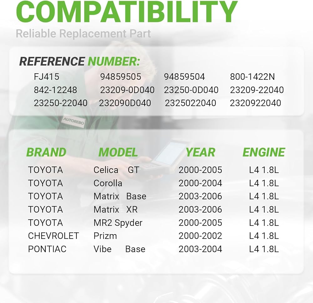 [Vehicle Fitment]: Compatible with Toyota Models:2000-2005 Celica GT L4 1.8L, 2000-2004 Corolla L4 1.8L, 2003-2006 Matrix Base L4 1.8L, 2003-2006 Matrix XR L4 1.8L, 2000-2005 MR2 Spyder L4 1.8L,●Compatible with Chevrolet Models:2000-2002 Prizm L4 1.8L,●Compatible with Pontiac Models:2003-2004 Vibe Base L4 1.8L
