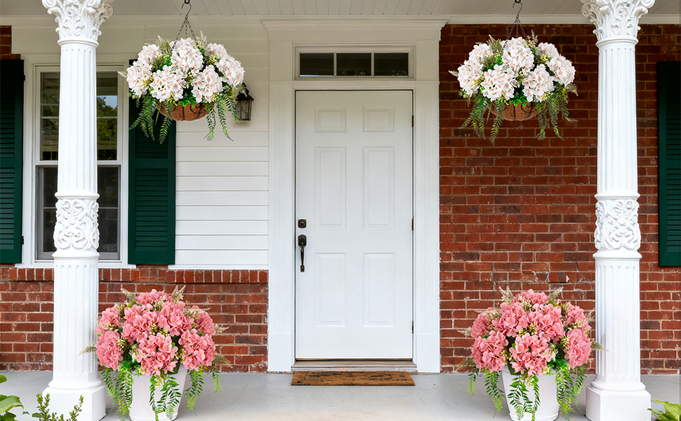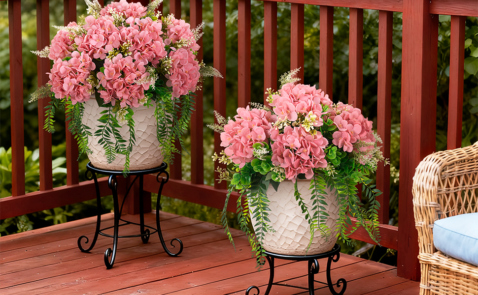 Artificial hydrangea plants for outdoors are perfect for adding a sense of vibrancy to your home decor. These fake flowers with greenery plants look stylish and lifelike, making them ideal for use in your patio, porch, balcony, garden, or indoor living room, bathroom, kitchen table all year round