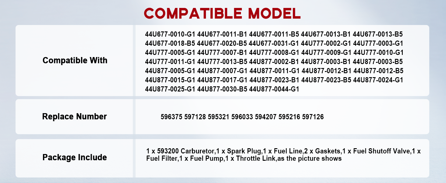 【Package Includes】1 x 593200 Carburetor,1 x Spark Plug,1 x Fuel Line,2 x Gaskets,1 x Fuel Shutoff Valve,1 x Fuel Filter,1 x Fuel Pump,1 x Throttle Link,as the picture shows