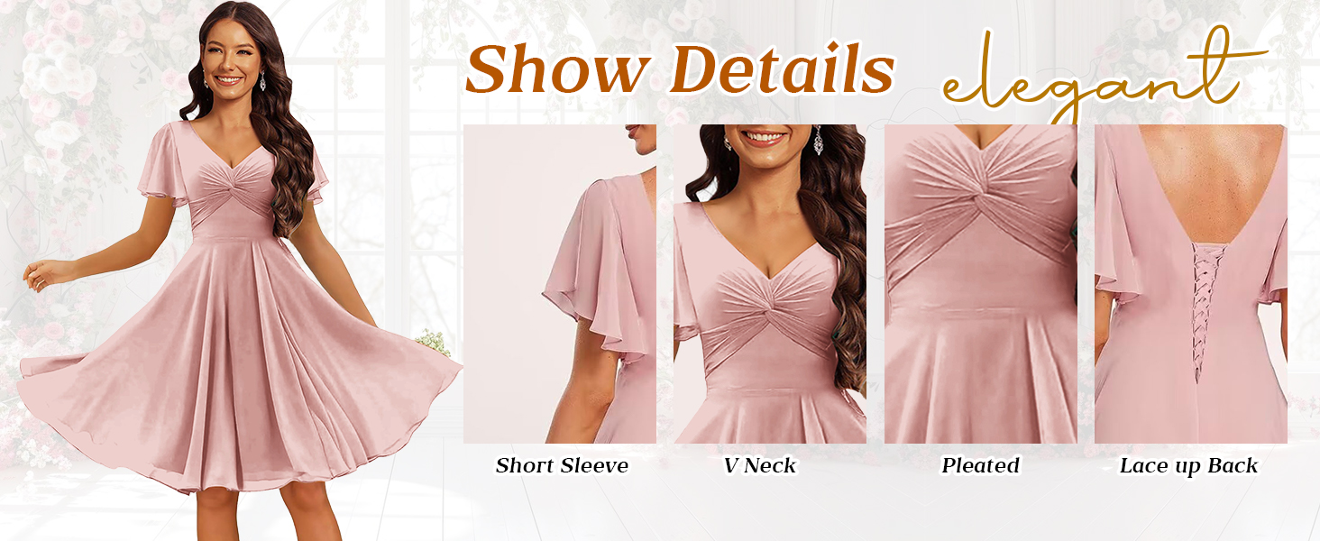 6.Embellishment: Ruffle/Short Sleeve, Chiffon, V Neck, Pleated, Empire Waist, Backless, Lace up Back