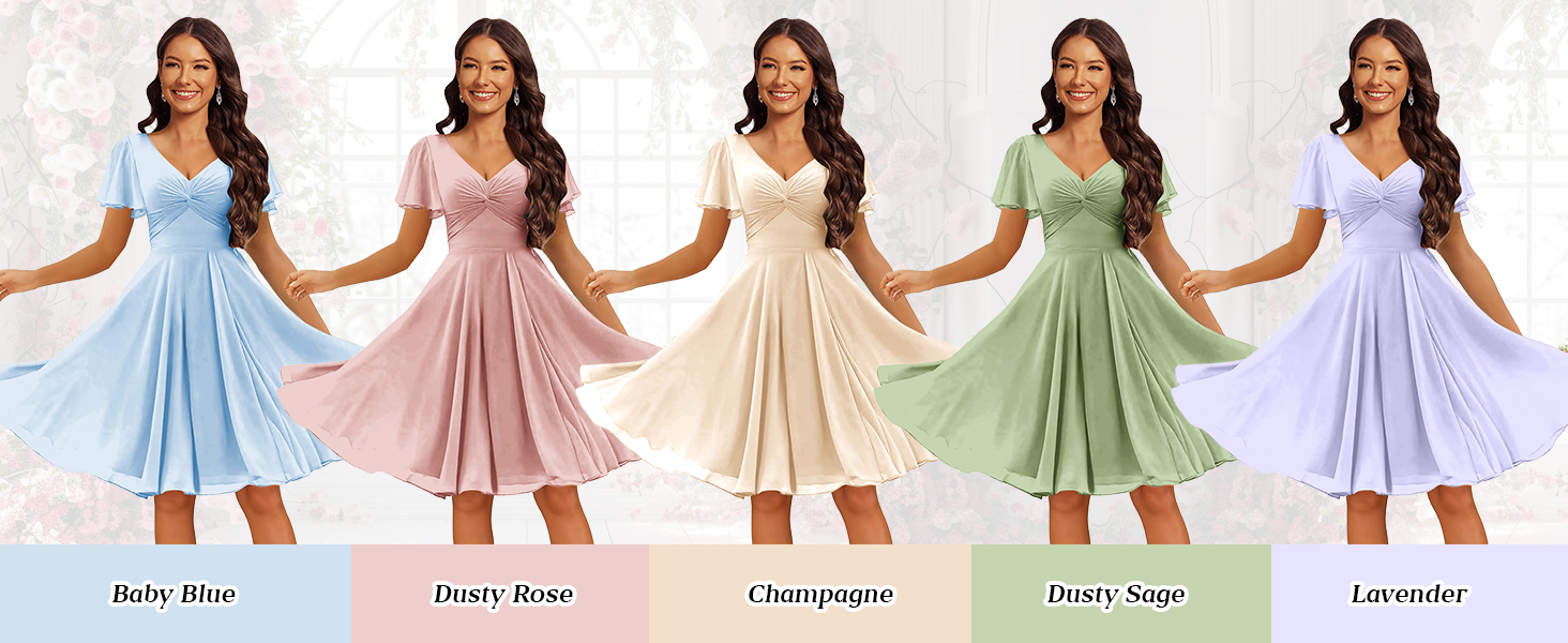INEWER Flutter Sleeve Pleated Bridesmaid Dresses Short with Pockets V Neck Chiffon Empire Waist Formal Dress for Women