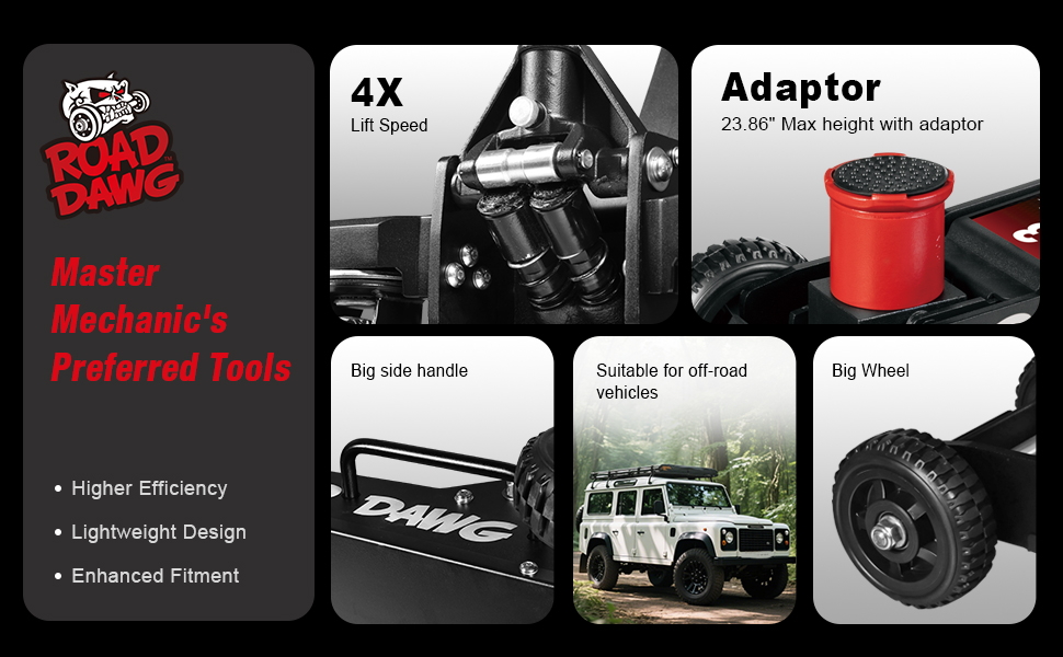 The lifting range of professional big wheel off-road jack without adapters is 5.98"-20.87". Lifting range with SUV adapter is 8.98"-23.86"