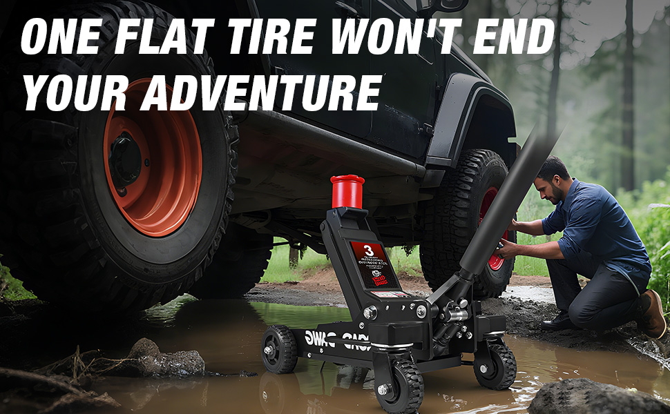 Engineered for extreme terrain, this heavy-duty hydraulic jack features 5.91-inch straight wheels and 4.51-inch swivel casters for superior mobility on mud, sand, and rocks. Its dual piston system delivers 6000LBS lifting capacity with safety overload protection, while aircraft-grade aluminum construction ensures corrosion resistance. This 3 ton off road jack fits full-size trucks, SUVs, and ATVs with tires up to 40 inches. Backed by a 2-year warranty – your essential off-road recovery tool.