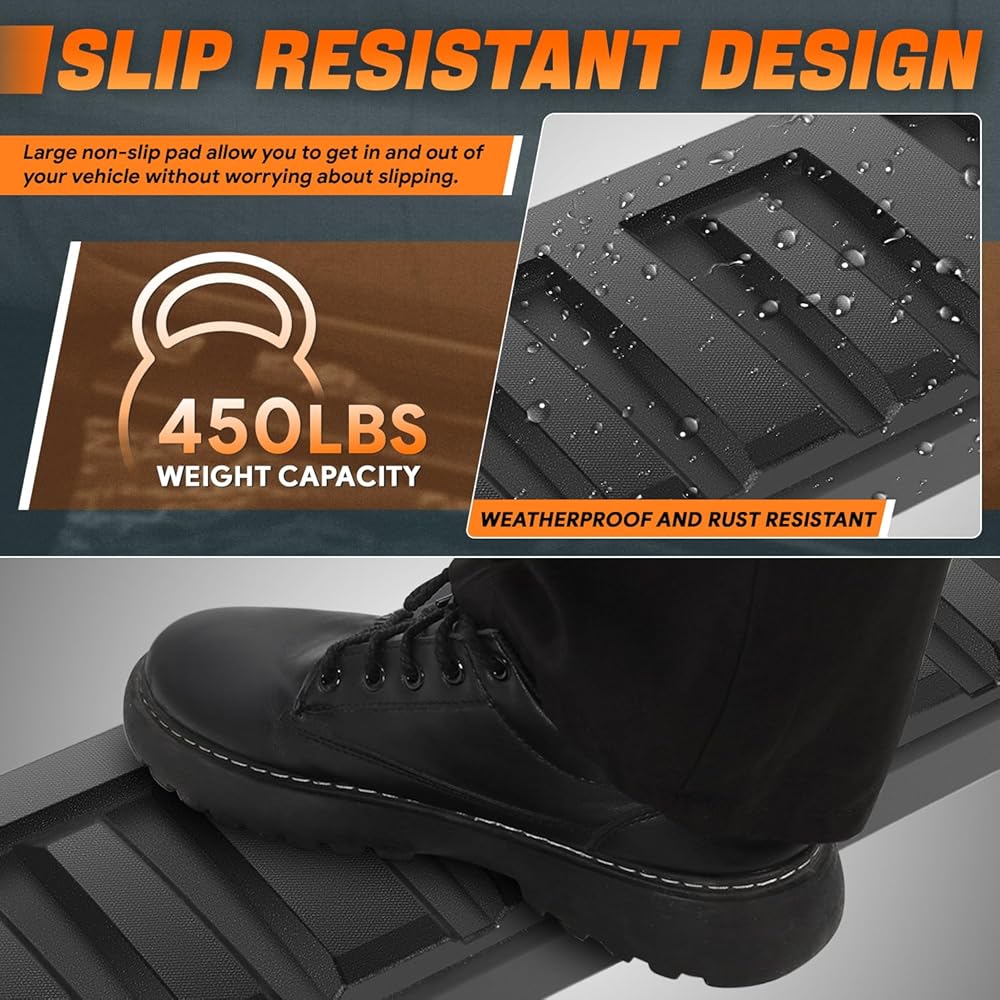 With a weight capacity of 450 lbs, the running board provides reliable support for passengers and cargo, ensuring stability and safety during use.