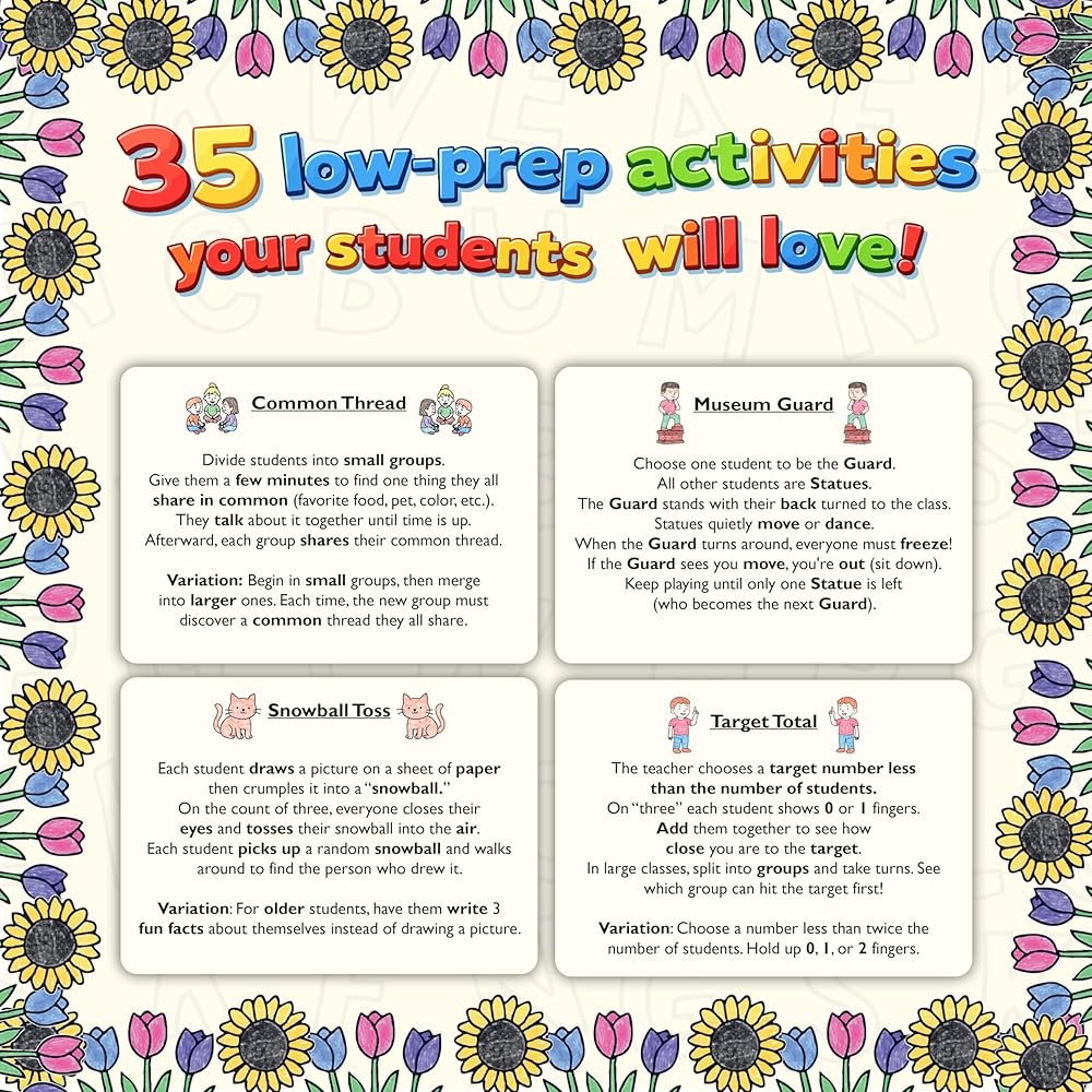 CLASSROOM-READY, DURABLE & EASY TO USE: Sturdy, full-color cards organized for quick grab-and-go use. Ideal for indoor recess, fast fillers between lessons, or as a quick classroom energizer.