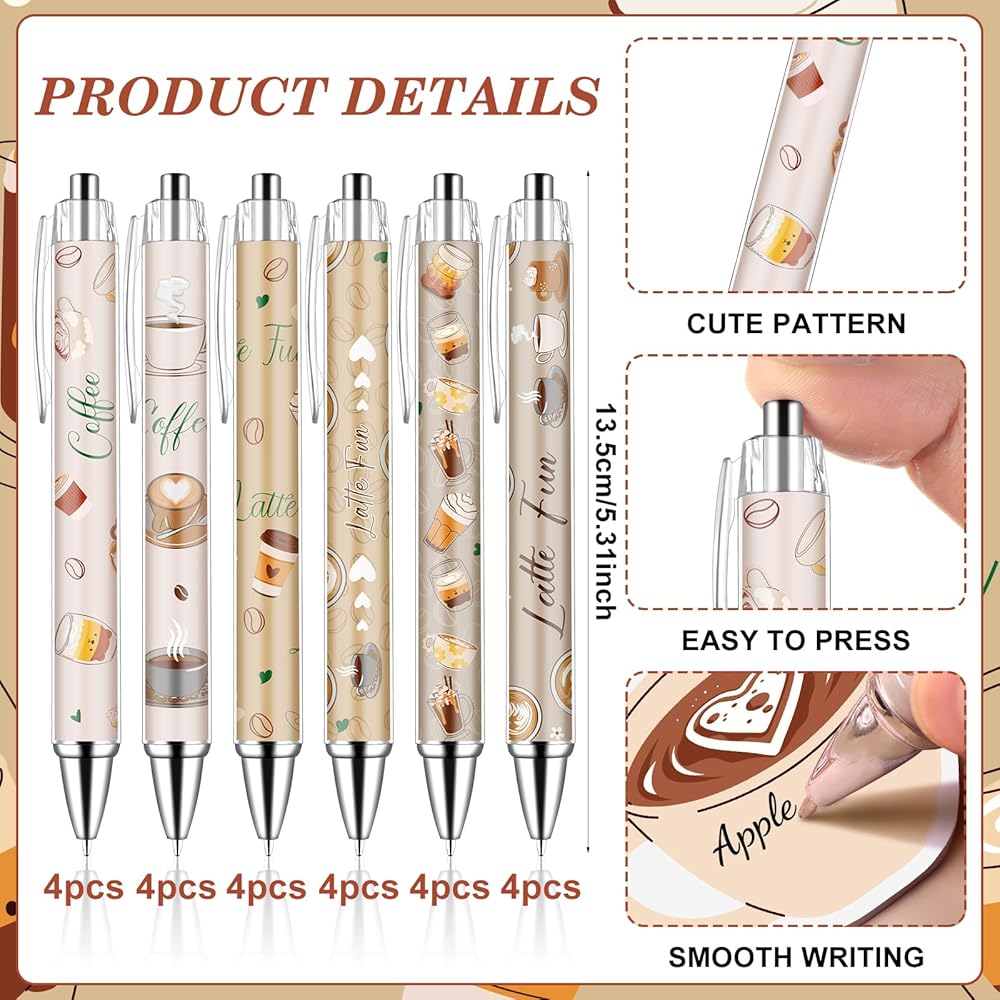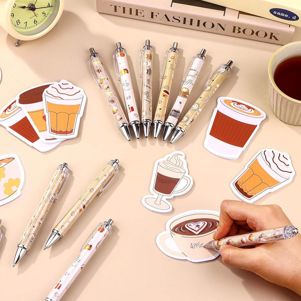 ☕【Package Contents】The package contains 6 different styles of coffee-themed ballpoint pens, 4 of each style, 24 pieces, and 6 different styles of self-adhesive coffee cup-shaped sticky notes, 4 of each style, 24 pieces. Your package contains a total of 48 pieces of ballpoint pens and sticky notes.