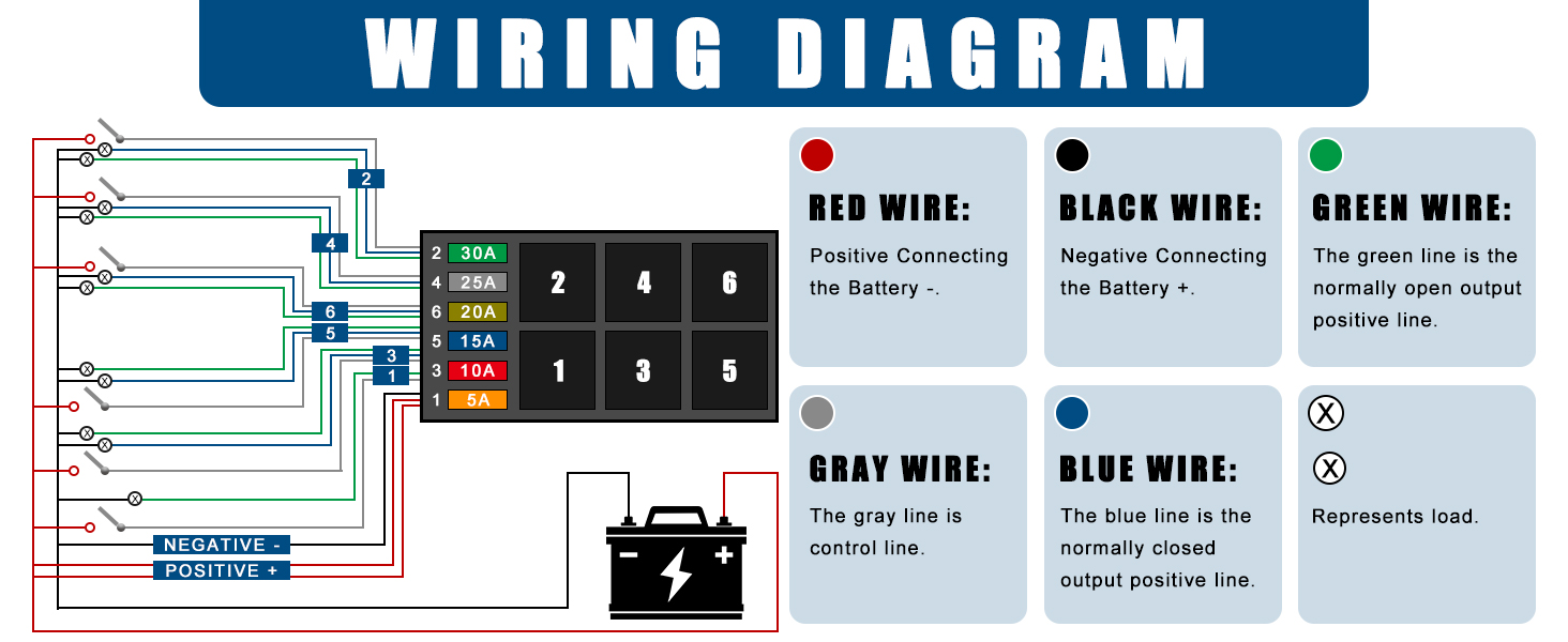 Package Includes: This 12v relay fuse box comes with pre-assembled wire harness, 6pcs blade fuses: 5A, 10A, 15A, 20A, 25A, 30A and 6pcs high quality 4-pin 40A relays for versatile electrical setups
