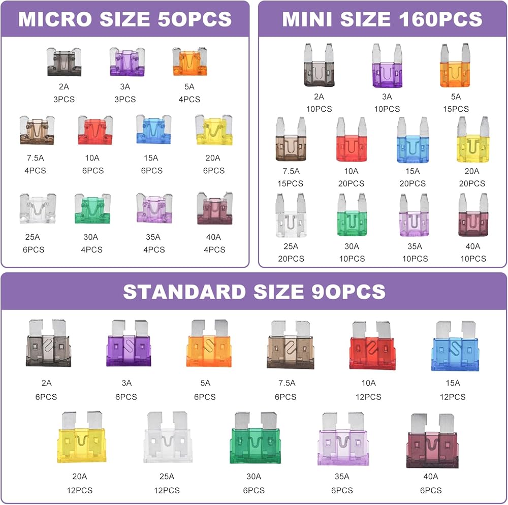 Package Includes: 50 PCS Micro Size Fuses, 160 PCS Mini Size Fuses, 90 PCS Standard Size Fuses, 1 Storage Box