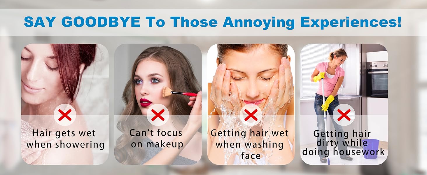 WIDE APPLICATIONS - Our super jumbo shower cap can fit for showering, cooking, home cleaning and SPA, keep your hair dry and block dust and oily fumes. Bath hair cap for women also can be used to tying hair when making up, cleaning face, applying facial mask, etc. Adding more convenience and beauty to your daily life.