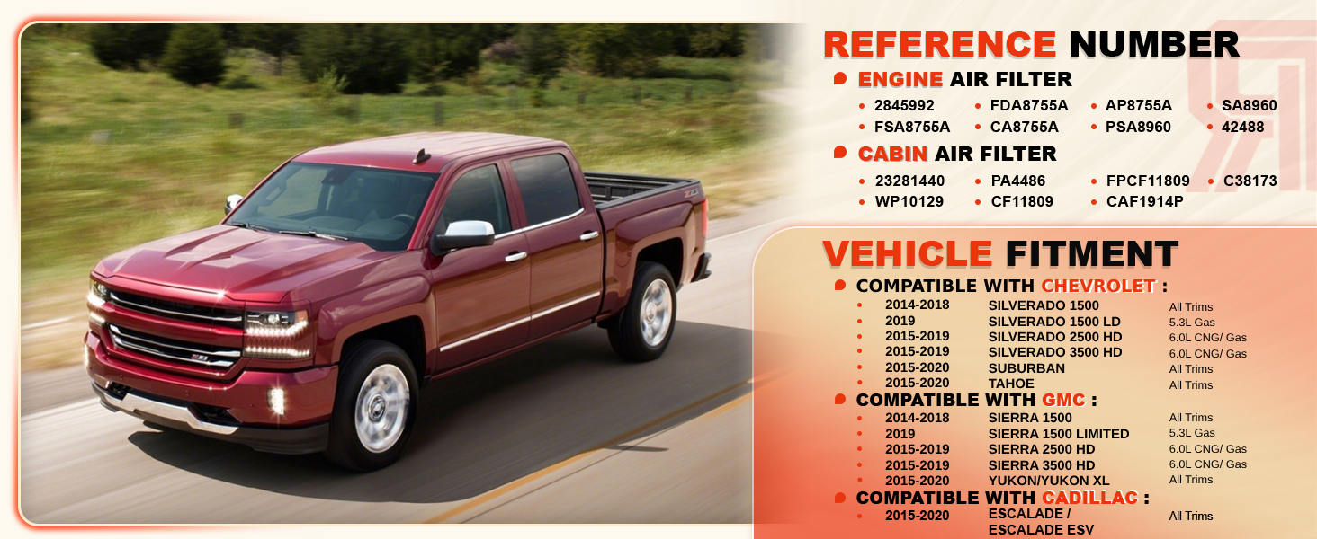 Replacement Part Number: Engine air filter: 2845992, FSA8755A, FDA8755A, CA8755A, CAP8755A, PSA8960, SA8960, 42488; Cabin air filter: 23281440, WP10129, PA4486, CF11809, FPCF11809, CAF1914P, C38173. NOTE: NOT FOR 6.6L Duramax Diesel Engine!!!. (Not for Silverado 2500HD 6.6L Diesel ,Silverado 3500HD 6.6L Diesel , Sierra 2500 HD 6.6L Diesel , Sierra 3500 HD 6.6L Diesel )
