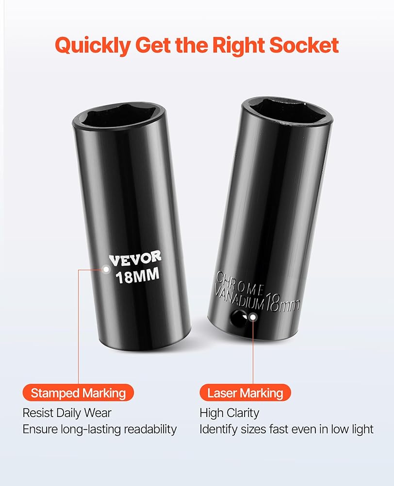 Easy-to-Read Size Markings: With laser and stamped markings, this impact socket set allows you to quickly identify the right size, even in low-light environments such as car undercarriages. The stamped design resists wear for long-lasting readability
