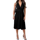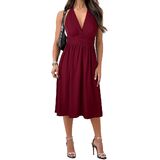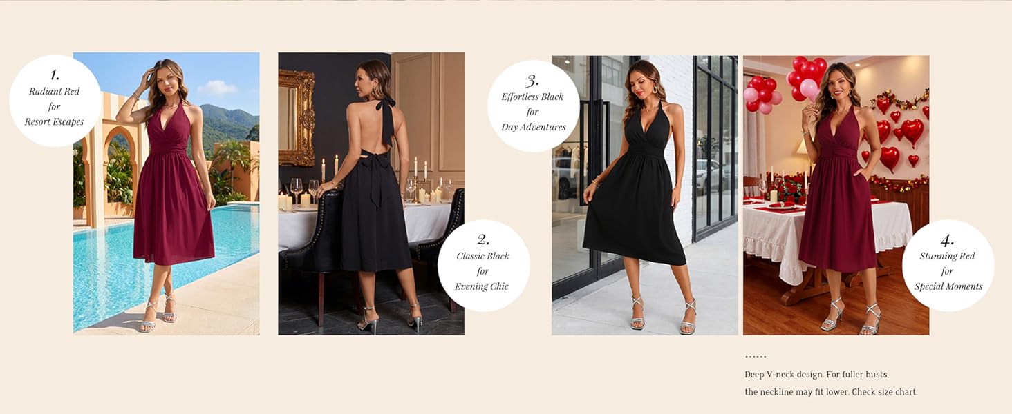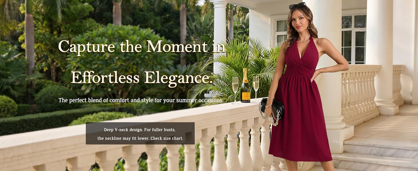 Halter Neck with Flattering Deep V Design Features a halter neckline with a plunging V-neck that highlights the collarbone and elongates the neckline, creating a feminine and elegant silhouette.