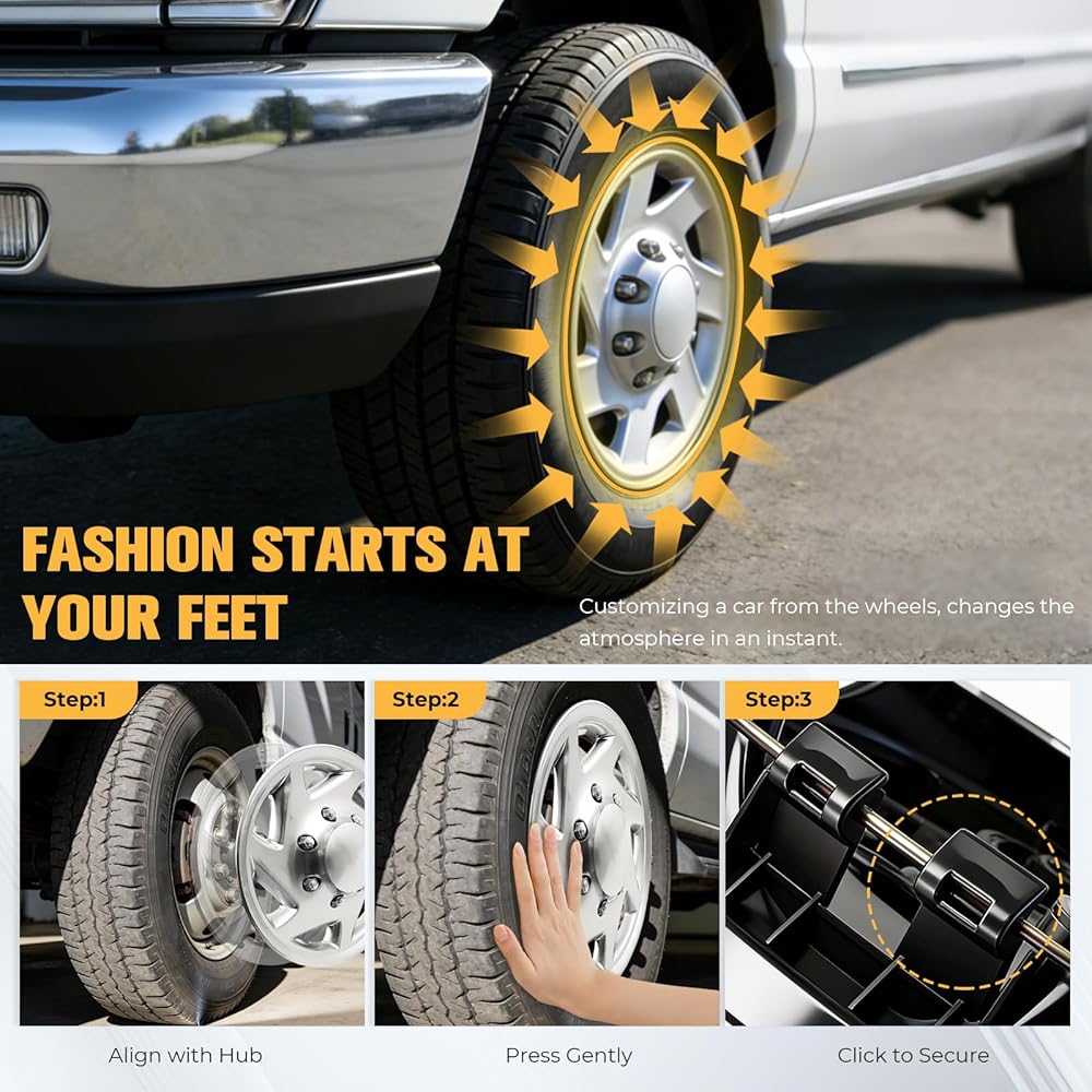 Tool-Free, Hassle-Free Installation:Align the hubcap with the wheel hub and press gently to lock into place – no tools required! The secure buckle design keeps it stable during driving, while easy disassembly makes cleaning or replacement quick (no more struggling with tight fits).