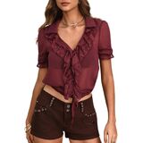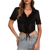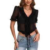 AGECODE Womens V Neck Lace Ruffle Short Sleeve Tie Crop Tops Sheer Chiffon Blouses Dressy Casual Button Down Shirts