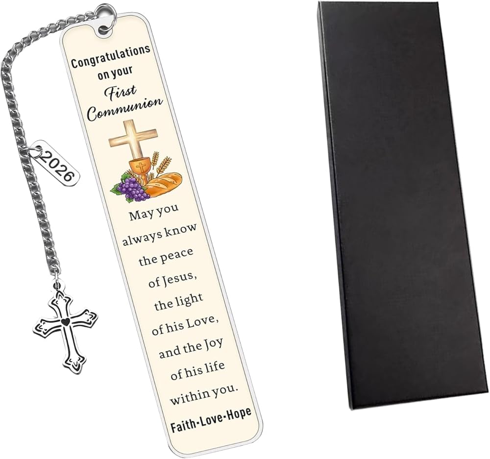 Meticulously crafted, the bookmark features a profound engraved message that offers blessings of peace, light, and joy in Christ. Accented with a classic cross and the year 2026, it becomes a personalized keepsake for significant religious celebrations in that year. Its sturdy metal construction and delicate chain ensure it will be a lasting reminder of faith and support.