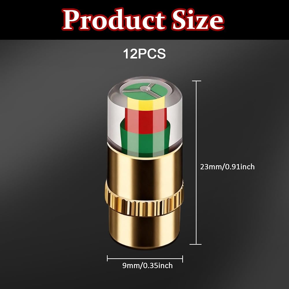 12 Pcs Car Tire Pressure Monitor Valve Stem Caps, Tire Caps with 2.4 Bar 36PSI Pressure Sensor, Visual 3-Color Eye Alert, Copper Core Tire Valve Caps for Cars, Motorcycles, Bicycles Premium Set of 10pcs Car Tire Pressure Monitor Valve Stem Caps: This package includes ten durable tire valve caps in sleek black, designed to fit most standard valve stems. Each car tire pressure monitor valve stem cap measures compactly to ensure easy installation and replacement for your vehicle's tire pressure monitoring system. High-Quality Material Construction for Longevity: Crafted with robust metal alloy, these tire pressure caps offer excellent corrosion resistance and durability. The sturdy design of our tire caps with sensor ensures long-lasting performance while protecting against wear and environmental elements. Accurate and Visual Tire Pressure Monitoring Function: Featuring built-in pressure sensors, these tire pressure caps provide real-time tire pressure readings. The tire pressure monitoring caps help maintain optimal inflation Easy Installation and Usage Instructions: Simply screw the tire pressure caps with pressure gauge onto the tire valve stems; no additional tools or equipment are needed. These tire valve stem caps are user-friendly and suitable for routine vehicle maintenance and quick checks of your car tire pressure monitor. Wide Compatibility and Application Range: Suitable for various vehicles including cars, motorcycles, and bicycles, these tire pressure monitor caps cater to any vehicle owner seeking to keep their tires properly inflated. Ideal for drivers who prioritize tire and performance, the tire valve caps offer reliable pressure monitoring for everyday use.