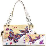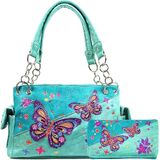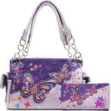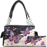Beautifully embroidered seasonal butterfly with blend of many vibrant colors. Accompanied with spring floral flowers, budding rose designs, and rhinestones. Our original shoulder handbags are classy with style and a gorgeous unique design. Structured rectangular shape with top handle pu leather straps for comfortable carrying and rests well on your shoulders. Interior showcases a middle zipper divider pocket, open and closed zipper pockets for better organization of your belongings. Magnetic snap flap closure side pockets for items that need quick retrieval. The back conceal carry pocket is large enough for popular handheld firearms like Glocks. Wide pocket on the back to fit your smartphone or handheld devices. Made from premium quality pu synthetic leather. Pu leather is leather made from inner splits of hide polished with polyurethane coating to deliver a more durable and sturdy purse. Fast priority shipping! Message us for any inquires and questions.