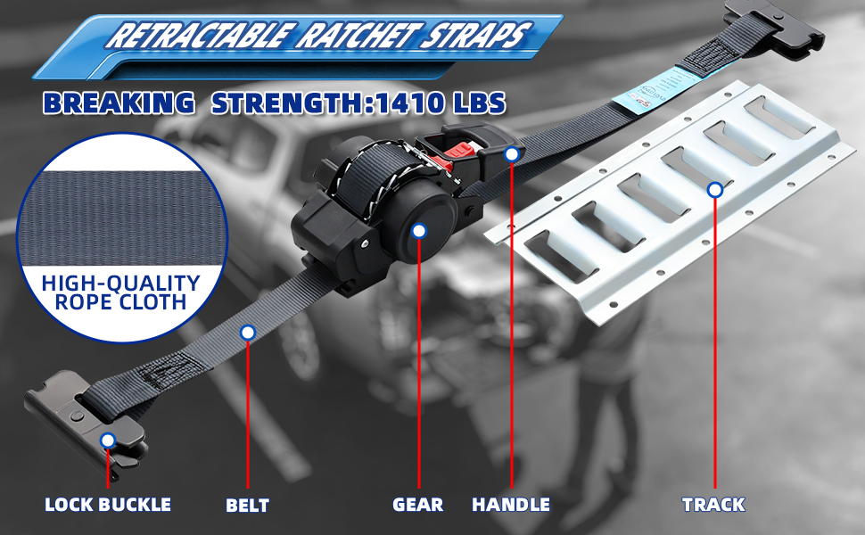 HIGH QUALITY: Retractable ratchet straps not easy to damage. Straps are made of durable polyester webbing. E buckle on both ends of the strap,The working load is 705 lbs and the breaking strength is 1,410 lbs.