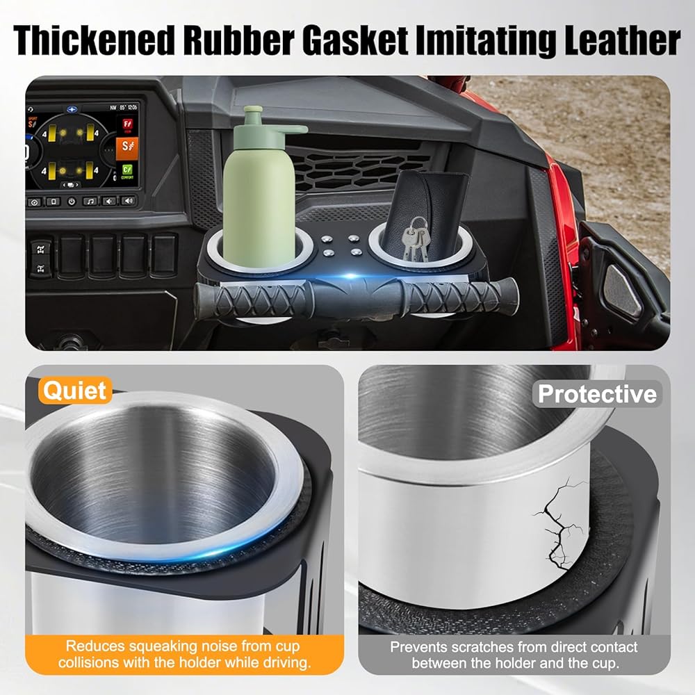Thickened Rubber Gasket: A thickened rubber gasket at the dual cup holder loop ensures a secure fit, Reduces the noise caused by cups clattering while driving., and protects your cups from wear and tear when the stainless steel cups are not in use.