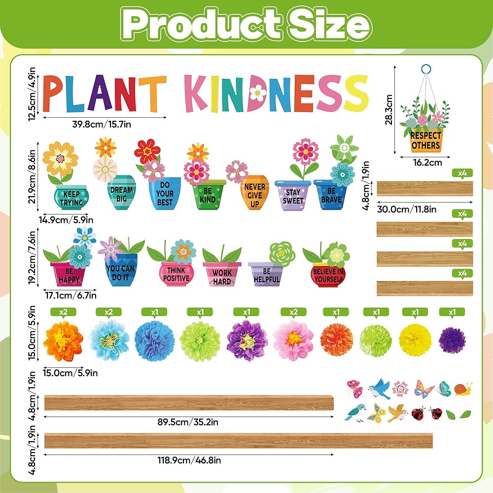 Bring a warm spring atmosphere to classrooms with this spring bulletin board decorations set, designed for teachers and students to create positive, engaging classroom decor. Package Contents: 47 paper cutouts 13 3d paper flowers 4 sheets adhesive dots Quality Materials: Made from printed paper material suitable for classroom use, supporting clear visuals and lightweight handling for bulletin board and chalkboard displays. Product Specifications: Weight 0.25kg/0.55lb Color:multicolorful Warm Tips: Place on clean, dry surfaces for best results. Adult assistance recommended during setup in classroom or preschool environments.